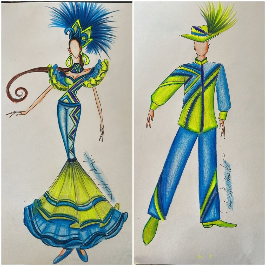 Las mujeres lucirán un body y pantalón elaborados en tela lycra, que resalta una figura entrelazada y asimétrica combinada con volantes en los hombros y botas campanas; también llevan su tocado con plumas, piedras y accesorios (aretes y collares) llamativos hechos artesanalmente. Entre tanto, los hombres llevarán una tradicional camisa en lycra con cuello y los mismos apliques que portan las mujeres, además de un sombrero decorado en tono verde. Todos los zapatos son antideslizantes, cómodos, resistentes al calor y de colores azules las mujeres y de verdes los hombres.